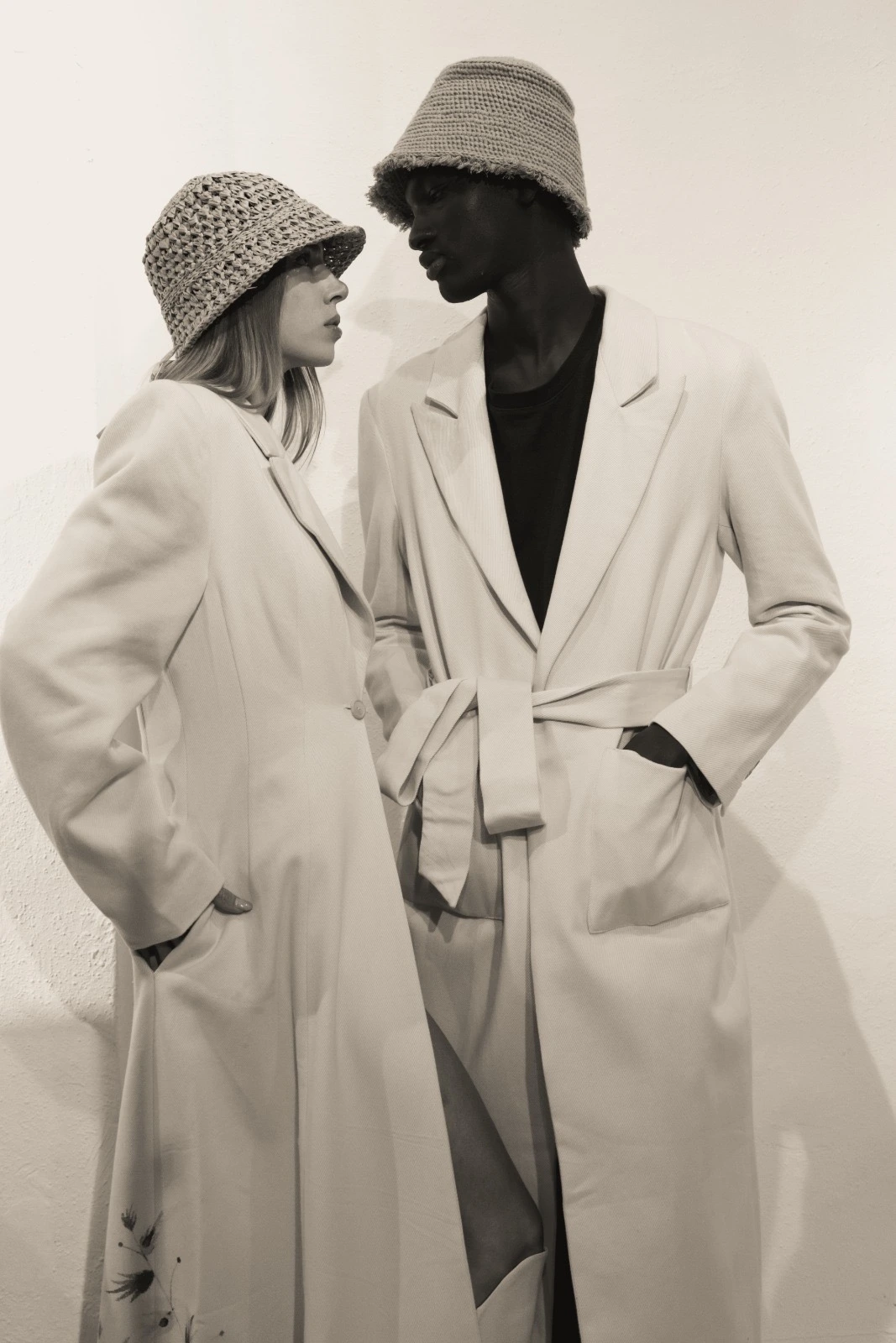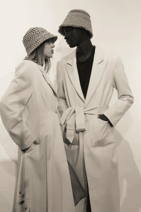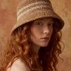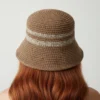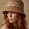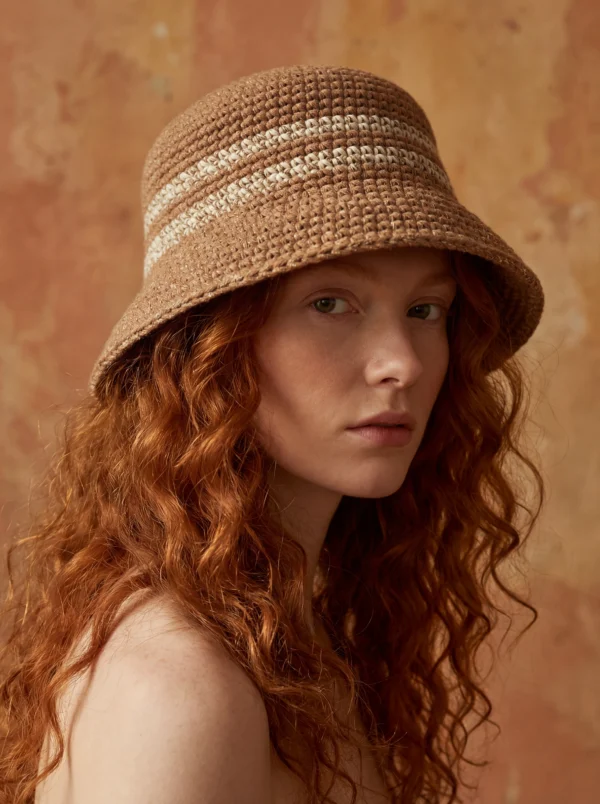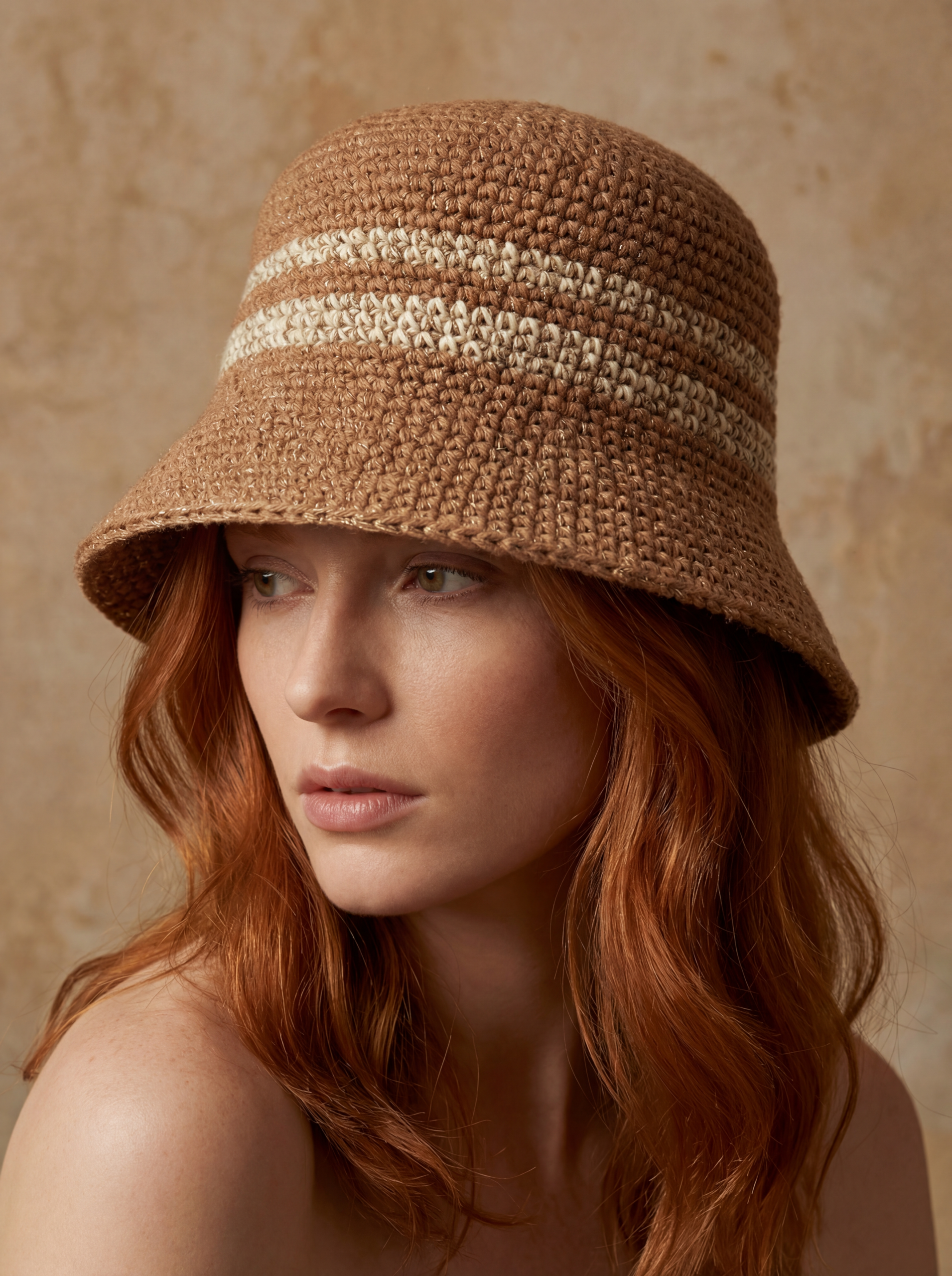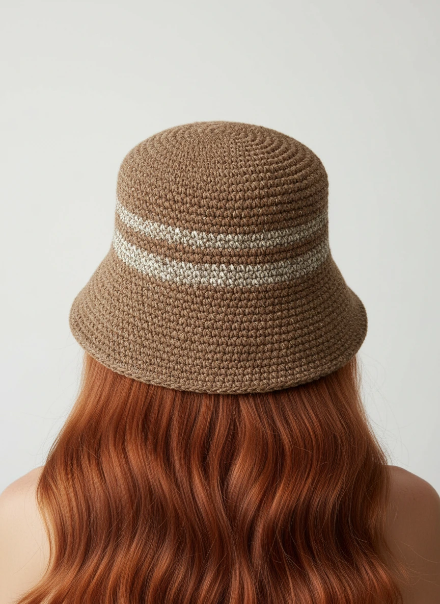 This bucket hat is crafted from 100% organic cotton yarn and features a dense, textured crochet construction. The design includes contrasting horizontal stripes near the crown, adding a subtle graphic detail to the otherwise minimalist silhouette. The hat maintains a soft structure with a gently shaped brim, offering comfortable coverage and an easy, everyday fit.