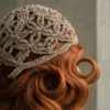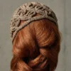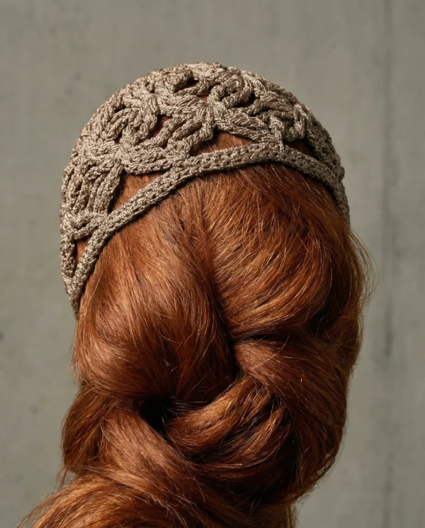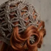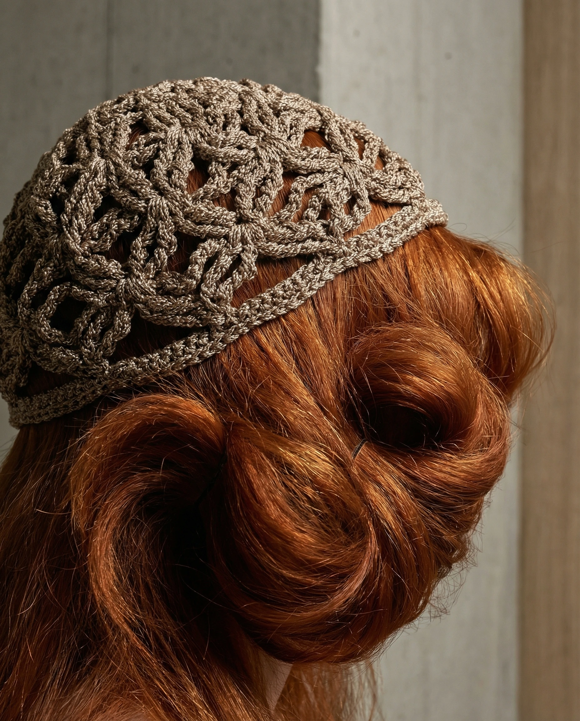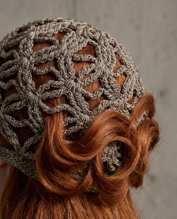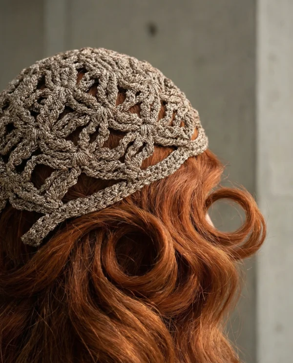 This cap is crafted from 100% organic cotton yarn and features a highly textured, sculptural crochet pattern. The design forms a series of raised, flowing lines that create a three‑dimensional surface across the crown. It fits snugly and comfortably on the head, offering a soft structure and a distinctive artisanal look.