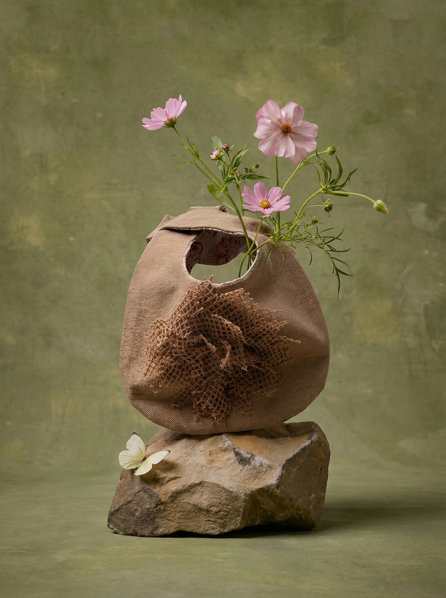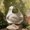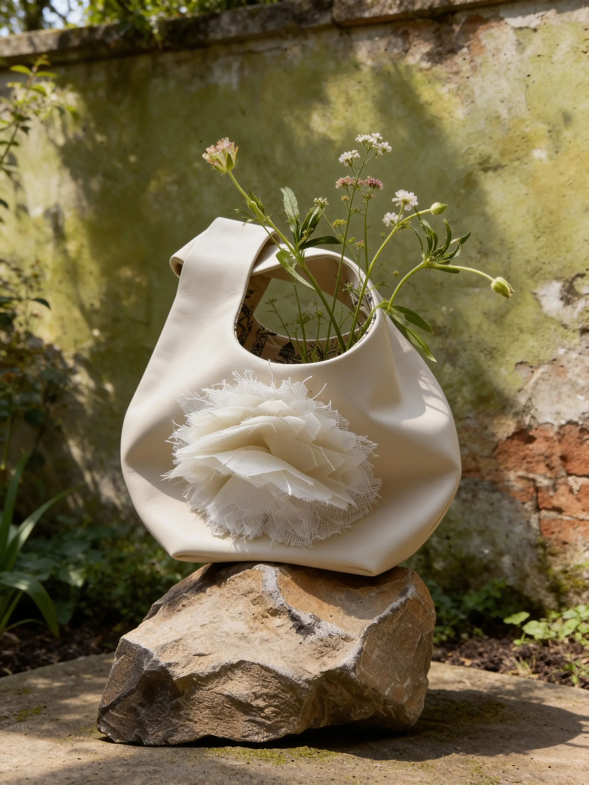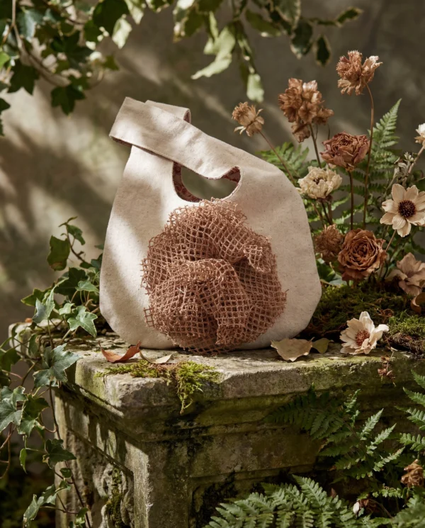 This compact bag is made from 100% organic cotton and constructed with a double‑layered body for added structure and durability. The interior is lined with your signature copyrighted pattern, providing a discreet branded detail. A small flower decoration adds a tactile accent to the exterior. Sized to fit a mobile phone, the bag offers a lightweight, minimalist carry ad decorative option.